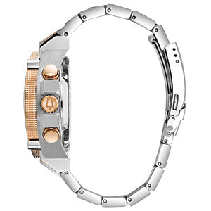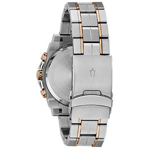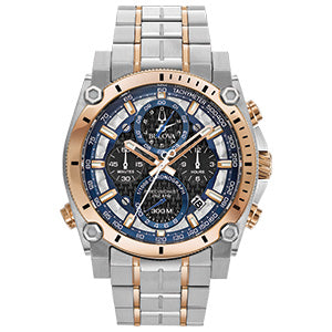 De la colección Icon con sincronización precisa a 1/1000 de segundo y segundero de barrido continuo, el cronógrafo es particularmente refinado. En acero inoxidable bicolor con cristal curvado, fibra de carbono negra multicapa, esfera azul, plateada y negra, segundero amarillo, manecillas luminosas de horas y minutos, marcadores luminosos, calendario, caja atornillada, corona atornillada y cierre doble seguro. Presione el cierre desplegable con cierre de seguridad. Impulsado por el movimiento Precisionist de cristal de cuarzo de tres puntas patentado de Bulova con una frecuencia vibratoria de 262 kHz, ocho veces mayor que la de los relojes de cuarzo estándar, para una precisión sin igual